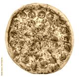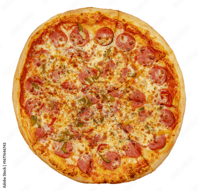 Whole full large pepperoni jalapeno salami pizza viewed from above, top view isolated on white background, cut out, round takeaway pizza, real traditional corporate classic American pizza, high res