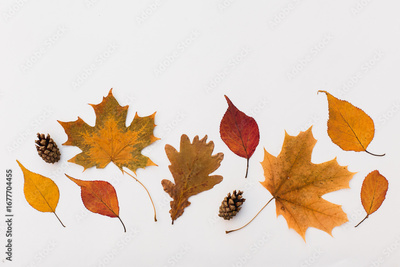 Autumn holiday frame composition with pattern made of leaf, punpkins, dried orange, pine cone on white wooden background. thanksgiving day, halloween eco zero waste concept. Minimal flat lay, top view