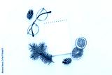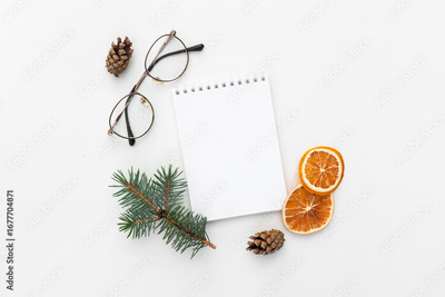 Creative holiday composition with blank notebook mock up, dried orange, glasses and pine cone on white background. To do list, planner and goals concept. Christmas, autumn concept. Flat lay, top view