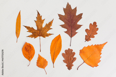 Autumn holiday frame composition, pattern made of different dried leaves on white wooden background. thanksgiving day, halloween eco zero waste concept. Minimal flat lay, top view