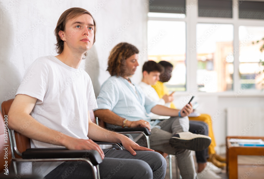 Young guy in casual clothes sitting in lobby of medical clinic, waiting for appointment with doctor