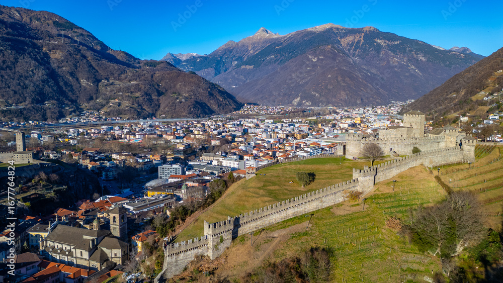 Panorama view of Bellinzona with Castello di Montebello, Switzer