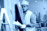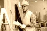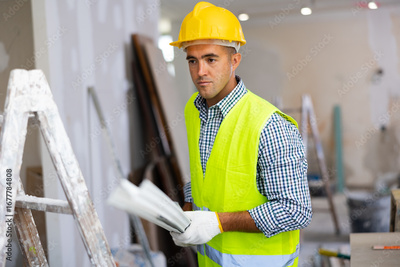 Young engineer in a hardhat and uniform, working on a construction site indoors during repairs, holds an aluminum profile for ..interior decoration