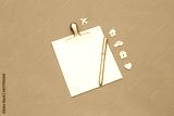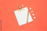 Wish list as figures lying next to notebook and pen on orange background . Concept with empty notebook for your goals, plans, decisions. View with copy space