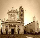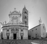 Panoramic view the collegiate parish of S. Ambrogio di Varazze, region of Liguria, province of Savona, Italy. A beautiful vision of the baroque architecture of the church in an enchanting square.