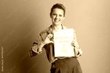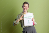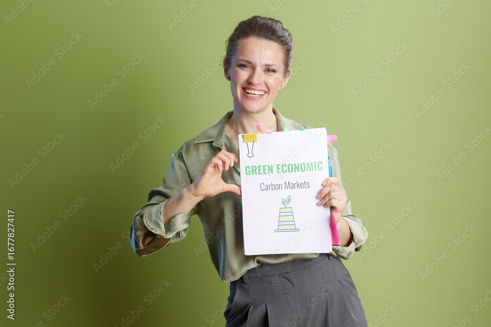 Smiling woman with Green Economic Carbon Markets papers making a heart shape, conveying positivity towards environmental sustainability.