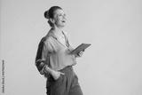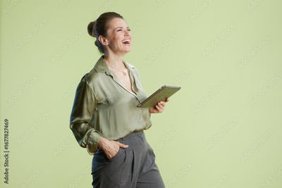 A laughing middle-aged woman holds a tablet, wearing a satin-like shirt and gray slacks, with a soft green backdrop. Expressing joy and amusement.