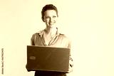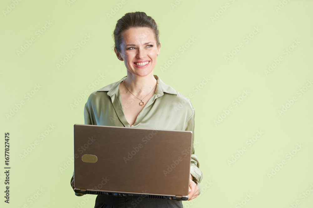 A middle-aged woman with a bun and light green shirt holds a laptop and smiles, creating a professional and positive image against a solid light green background.