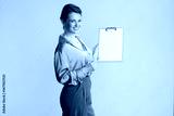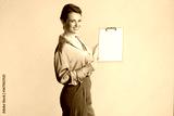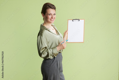 A smiling woman points to a blank clipboard, presenting information with confidence. Dressed in green satin and grey, she's a true professional.