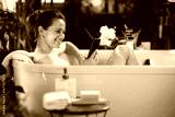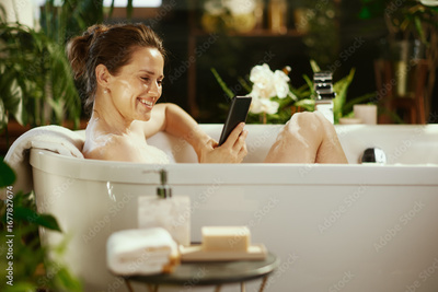 Smiling woman with light brown hair relaxes in white bathtub, using black smartphone. Surrounded by lush green plants & warm natural light, scene blends modern leisure with tranquil self-care.