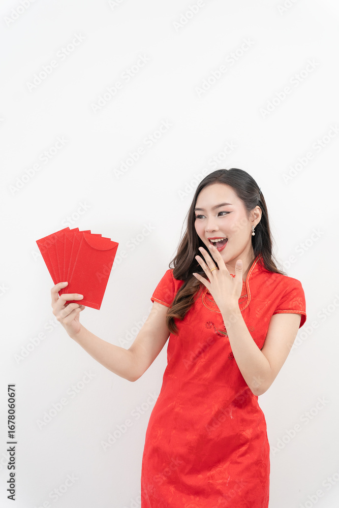 Young Asian woman holding red envelopes of Chinese New Year gifts in Chinese New Year concept isolated on white background.