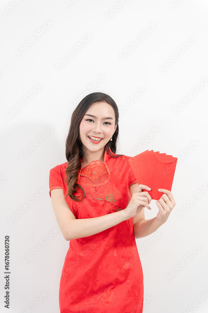 Young Asian woman holding red envelopes of Chinese New Year gifts in Chinese New Year concept isolated on white background.
