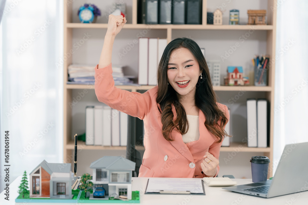Excited young Asian real estate agent sells her house for investment and offers business and finance presentations.