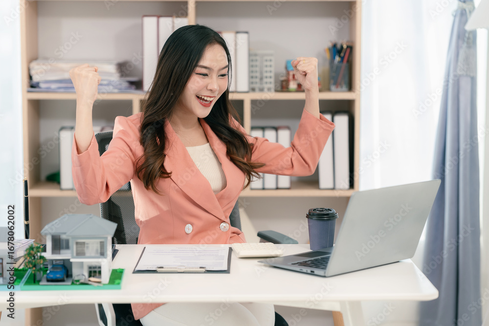 Excited young Asian real estate agent sells her house for investment and offers business and finance presentations.
