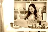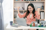 Excited young Asian real estate agent sells her house for investment and offers business and finance presentations.