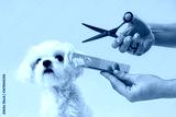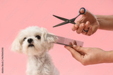 Female groomer with scissors and comb taking care of cute Maltese dog on pink background