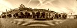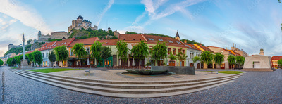 Sunset view of Trencin castle overlooking piece square, Slovakia
