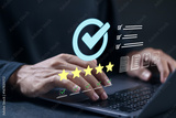 Quality control certification concept, check guarantee of standard of company product. Businessman using laptop with checklist documents, assessment for certificate and document approved.