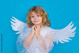 Valentine's day. Blonde cute child with angel wings on a blue studio background. Happy angel child.