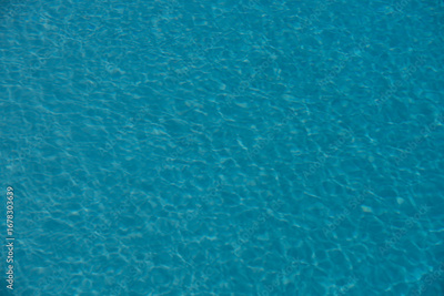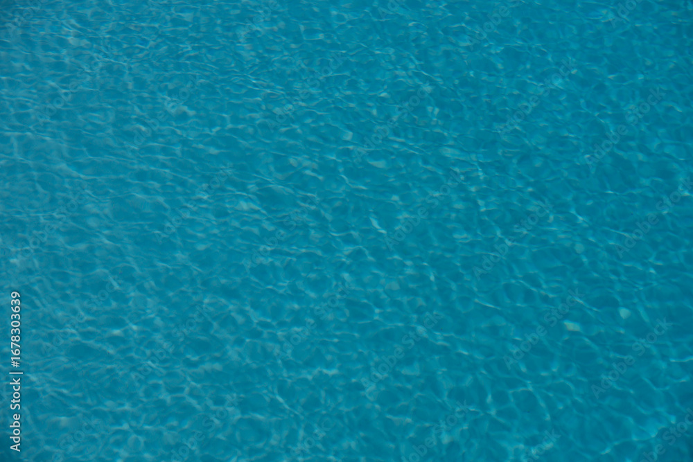 Blue pool water background. Blurred transparent clear calm water surface texture. Water waves in sunlight with copy space.