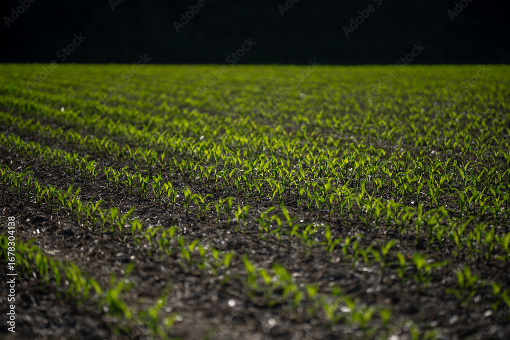 Corn growing in fertile soil. Young corn plants sprouting in field. Cultivated in spring. Seeds planted in rich ground. Plant growth in meadow. Farming corn on open land. Corn plants growing on farm.