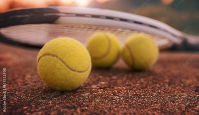 Tennis ball with racket on the tennis court. Sport, recreation concept