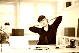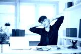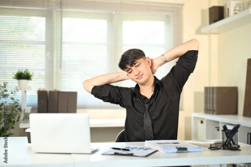 Tired businessman stretching his neck at desk after long hours of computer work in modern office.