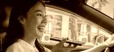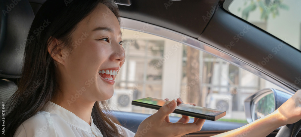 Smiling Asian woman sitting in a car and hands on the steering wheel with talking on the smartphone.