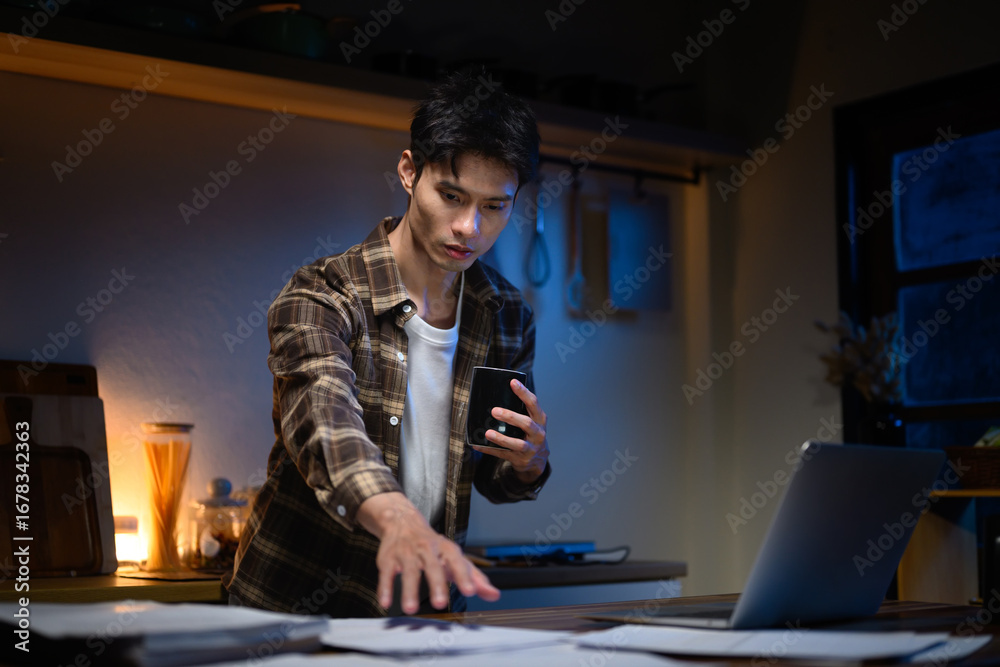 Asian man standing at kitchen counter with coffee cup and laptop, working from home