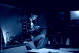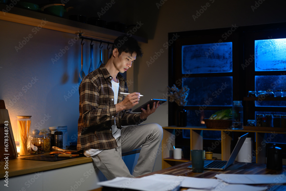 Young man working late at night, using a digital tablet with stylus in a kitchen workspace