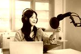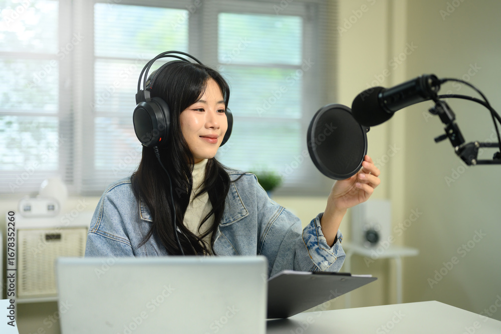 Young woman wearing headphones adjusting microphone while recording podcast at home studio