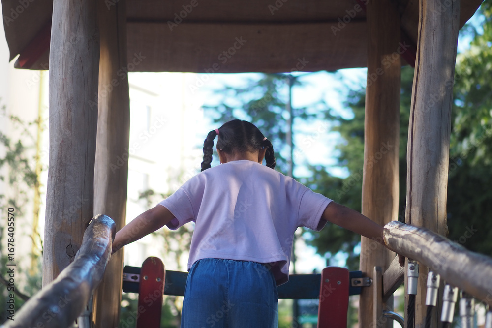 Child playing on playground equipment during daytime