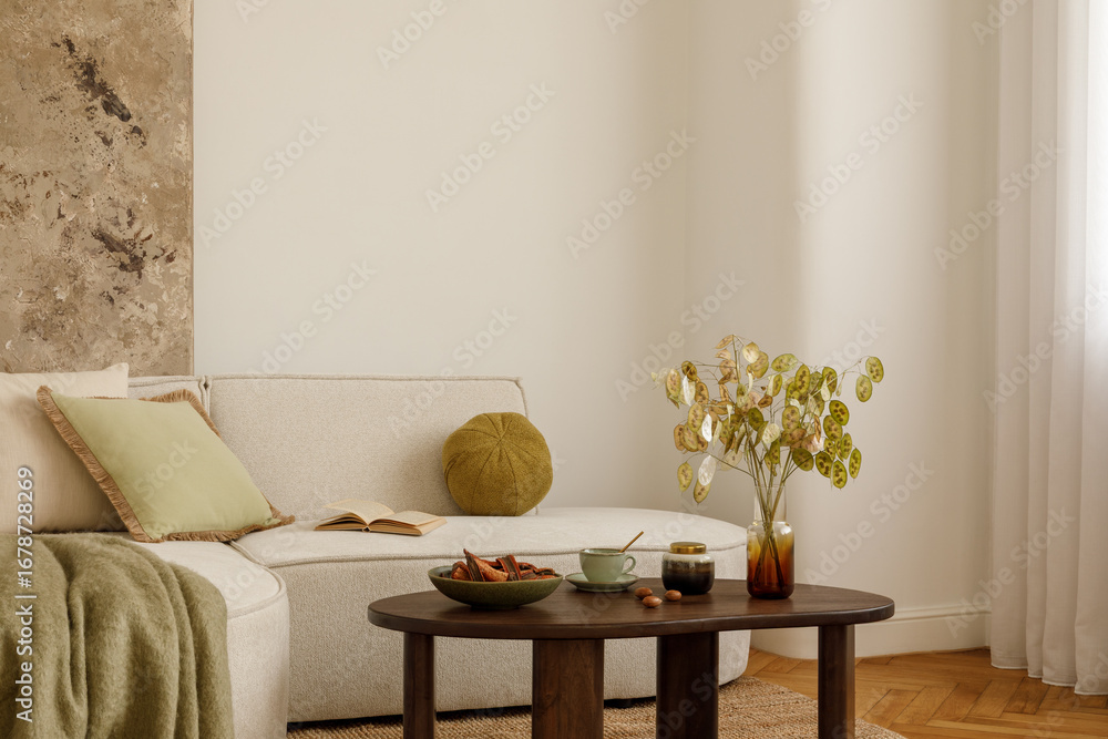 Cozy living room with beige sofa, green cushion, wooden coffee table and dried lunaria flowers in a vase.