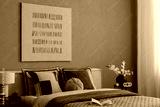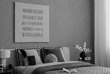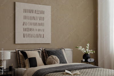 Contemporary bedroom interior with neutral bedding, black and beige pillows and white gladiolus in a vase. Minimalist style.