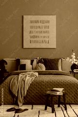 Modern bedroom with beige quilted bedding, patterned cushions, small stool with books and decorative mock up wall art.