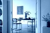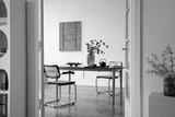 Dining room with wooden table, rattan chairs and green vase with eucalyptus, decorated with teapot and fruit in a bright modern interior.