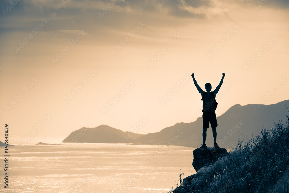 Victory, winning, adventure, goals concept. Man standing on mountain with arms in the air celebrating.