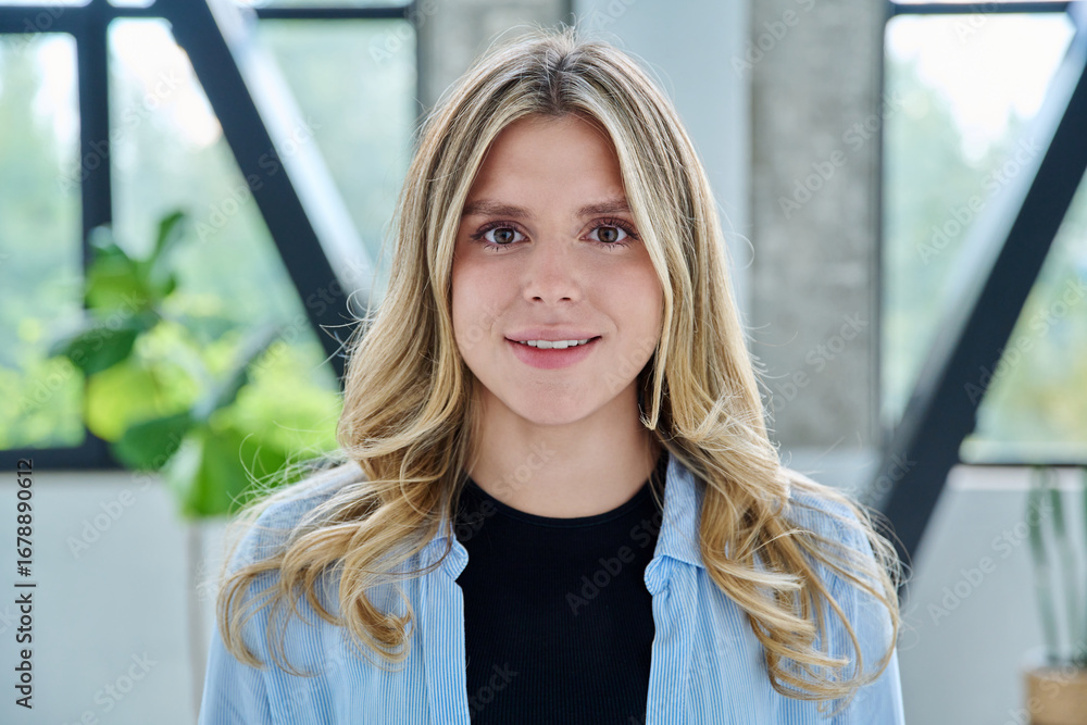 Headshot portrait of young happy woman posing in home