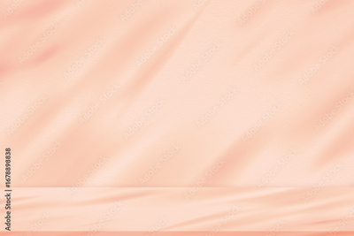 Autumn background,Minimalistic simple backdrop for fall season product presentation.Studio background with shadow of plant foliage and light on orange wall and floor,Interior room with pink light