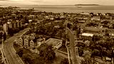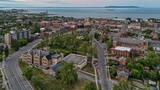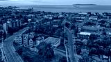 Aerial view of Thunder Bay with historic buildings and Lake Superior.
