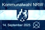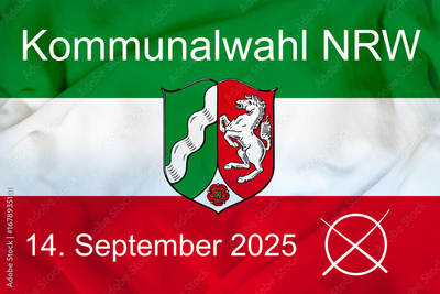 Grafik mit der Flagge von Nordrhein-Westfalen mit Text KOMMUNALWAHL NRW 14. SEPTEMBER 2025
