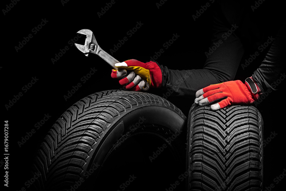 Winter car tires service and hands of mechanic with wrench, screwdriver on black background.