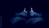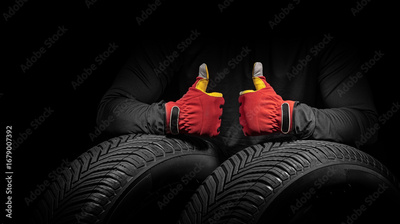 Winter car tires service and hands of mechanic with wrench, screwdriver on black background.