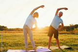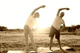 Mature couple doing a side stretch yoga pose in a grassy field during sunset.