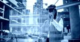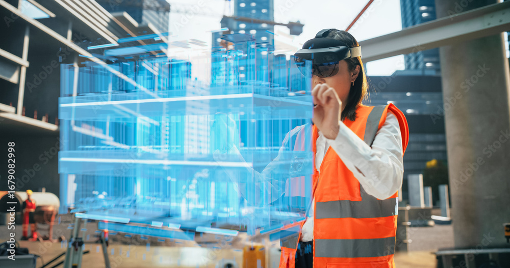 Japanese Female Architect Wearing an Augmented Reality Headset and Inspecting a Digital Hologram of a Building. Asian Civil Engineer Using a Software with Virtual Construction Plan and Interior Model