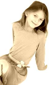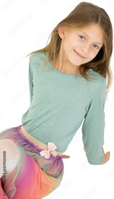 A sweet young girl wearing a pastel outfit with sparkly details and a colorful tulle skirt, capturing a moment of pure joy.
