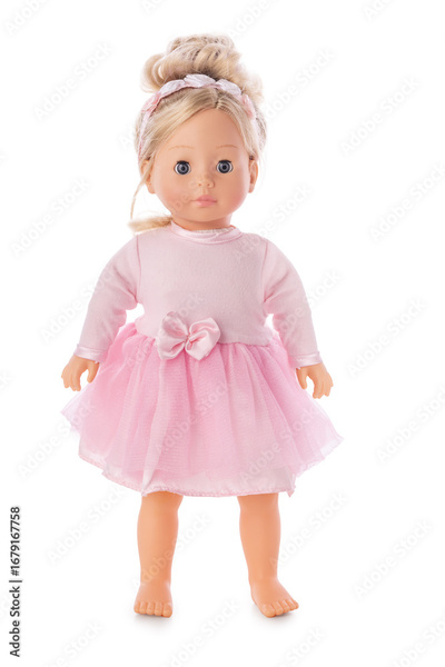 Beautiful ballerina doll little girl Wearing Pink Tutu with Bow and Floral Headband isolated on White background