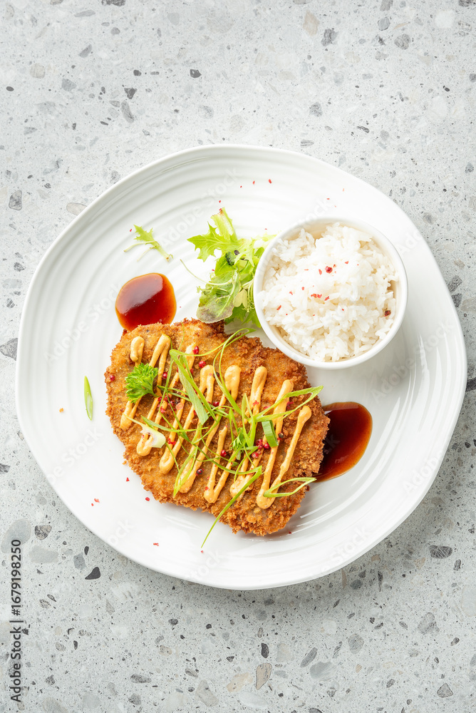Plated Japanese-style katsu with creamy sauce, microgreens, and rice. Minimalist restaurant presentation, ideal for food photography and culinary content.