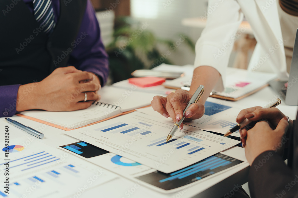 Business team collaborating in a corporate meeting, analyzing financial data and developing innovative strategies for future growth