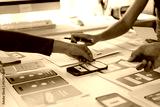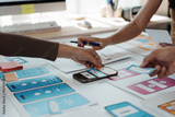 User experience designers collaborating on a fresh mobile application template, focusing on innovative strategies and effective user interface design